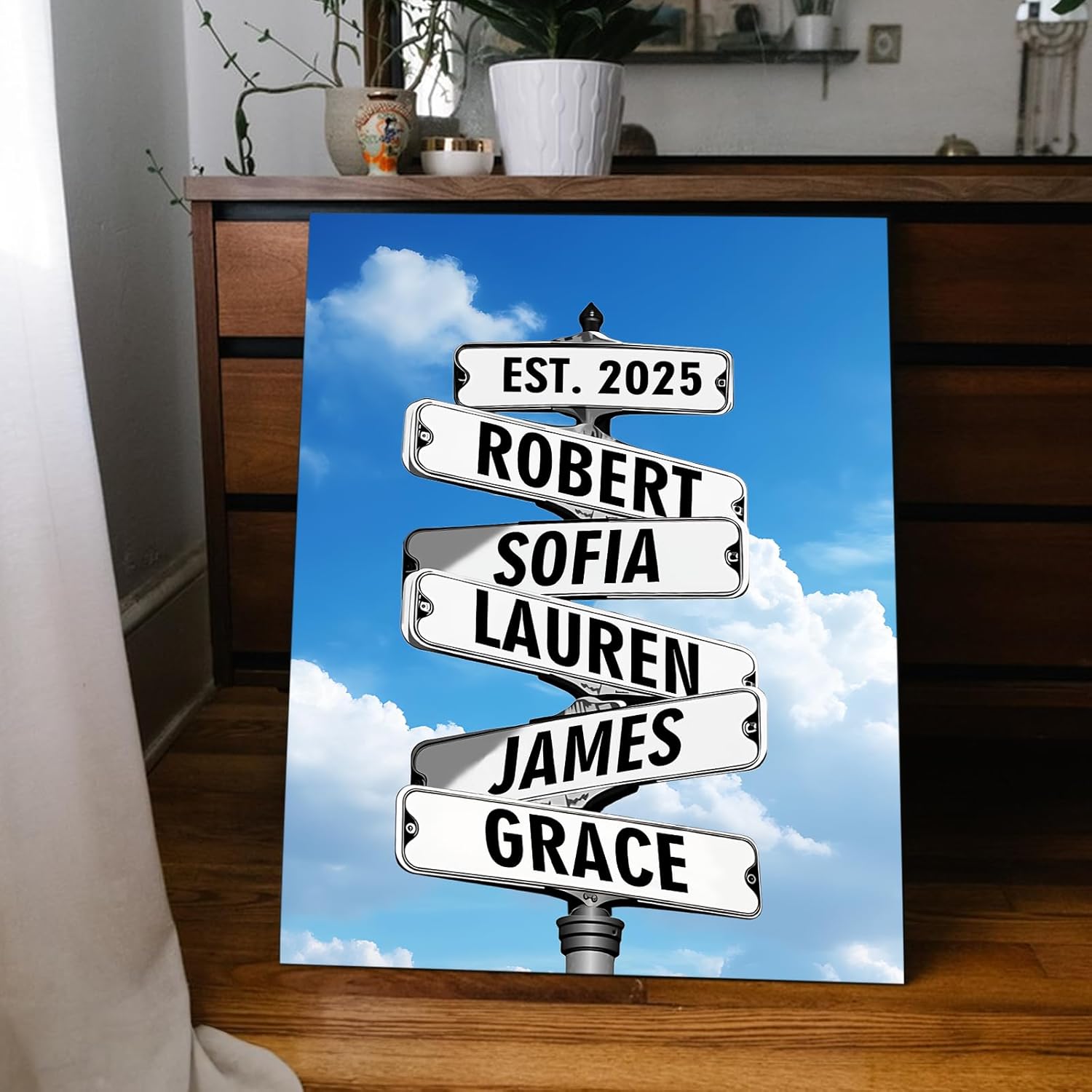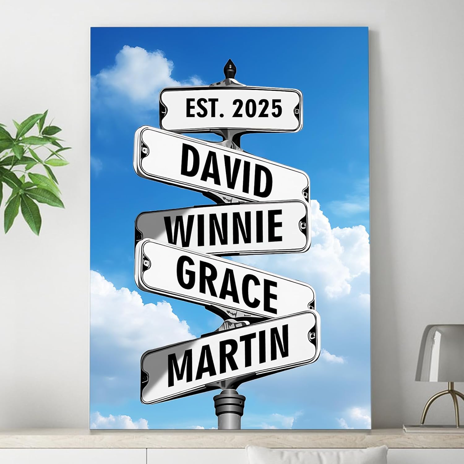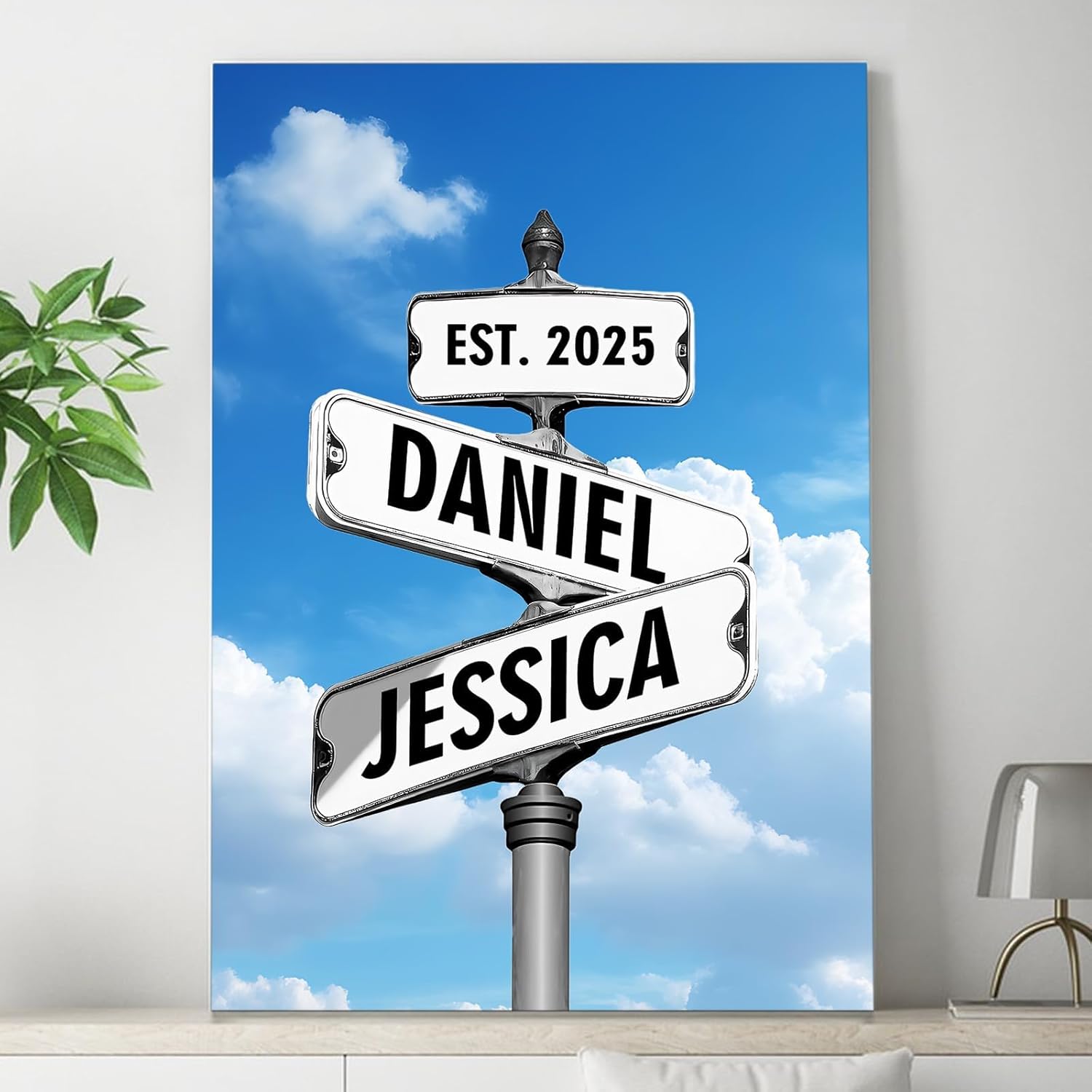 I. Product Specifications:Size: 8"W x 10"L,12"W x 18"L,16"W x 24"L,20"W x 30"L,24"W x 36"L,20"W x 24"L,24"W x 30"L,16"W x 20"L,8"W x 12"L,30"W x 40"L,24"W x 32"L,18"W x 24"L,12"W x 16"LMaterial: CanvasFrame Type: 1.5" deep solid wood framesPersonalization: Name and DateDesign: Vintage Street Sign CrossroadOccasion: Valentines Day, Wedding, Anniversary, Christmas,BirthdayII. Product Highlights: Elevate your home decor with this personalized vintage street sign canvas framed gift for couples. The custom date crossroad sign poster prints wall art with names adds a unique touch to any room. Made of high-quality canvas, this customized gift is perfect for showcasing your love and creating a special atmosphere in your home. Surprise your girlfriend, boyfriend, husband, wife, or any loved one with this thoughtful and meaningful gift that commemorates your relationship.III. Usage Scenarios:Display in the living room or bedroom as a romantic and personalized decorationGift to your significant other on special occasions such as Valentines Day, anniversary, or ChristmasCustomize with your names and a memorable date for a one-of-a-kind piece of wall art that celebrates your relationshipBoost your sales by highlighting the product's customization options, sentimental value, and suitability as a perfect gift for couples. Optimize your listing with popular keywords like custom canvas, personalized gift, and husband and wife gifts to attract potential buyers looking for unique and thoughtful presents.